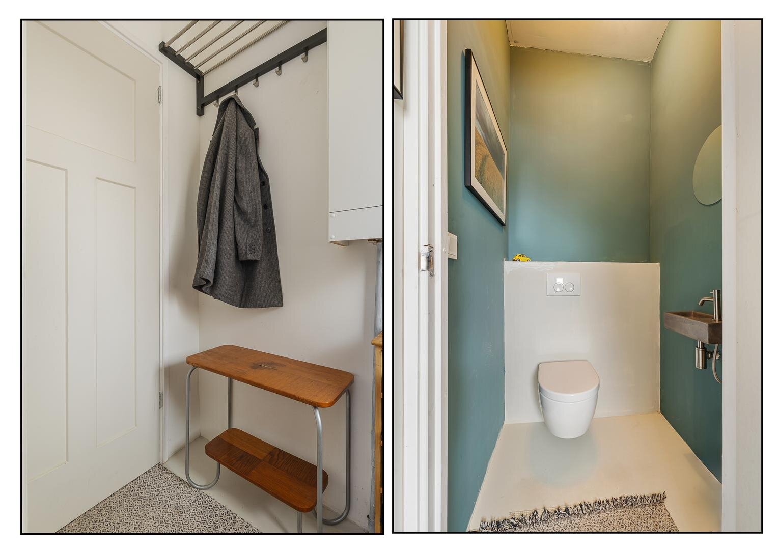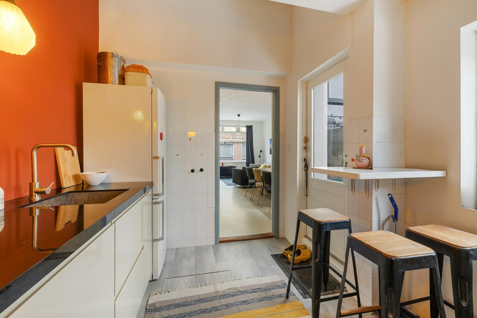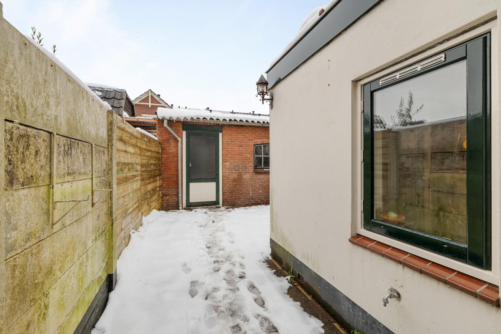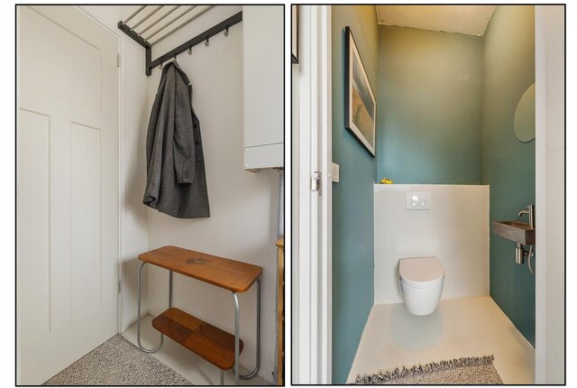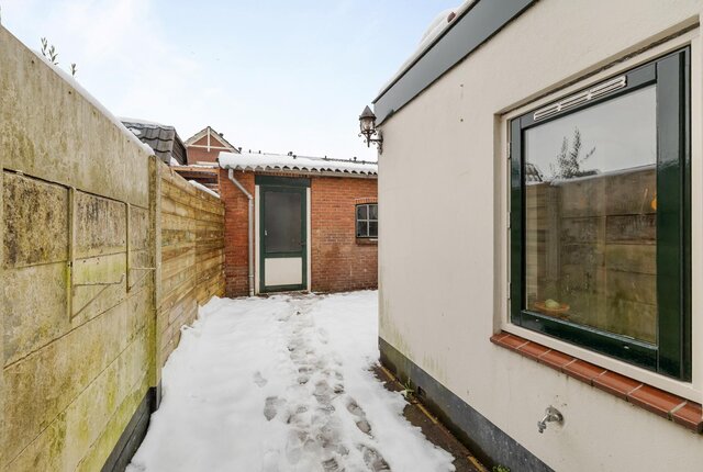 Entree/vestibule, modern toilet met fonteintje, woonkamer met gezellige nis en vaste kast op de plaats van de vroegere bedstee, moderne keuken met bergkast met wasmachine opstelling, toegang tot de kelder via een luik en vaste trap en deur naar de de zonnige achtertuin met ruime berging!