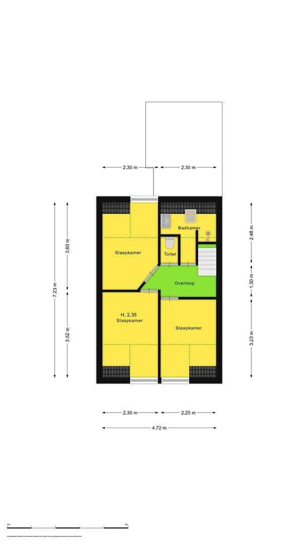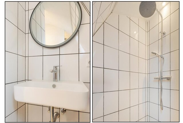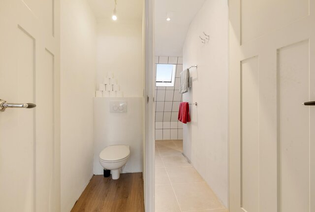Op de verdieping biedt de overloop toegang tot twee slaapkamers aan de voorzijde en een derde slaapkamer, het separate toilet en de badkamer aan de achterzijde. De badkamer is voorzien van een inloopdouche en een wastafel.