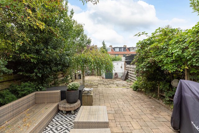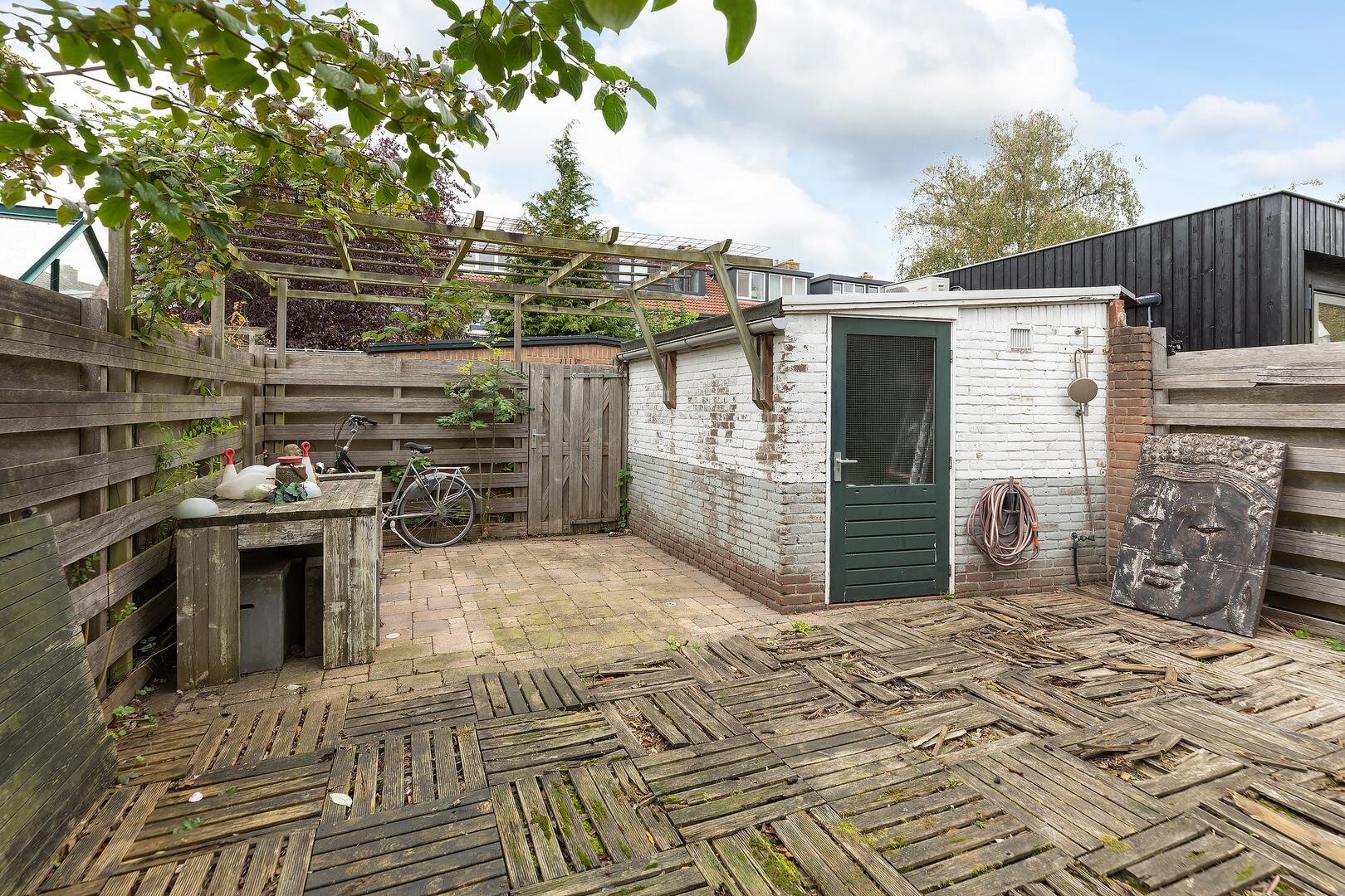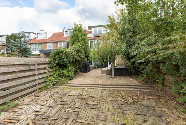 De circa 16 meter diepe en zonnige achtertuin is gelegen op het westen en beschikt over een ruime berging met elektra en een achterom.