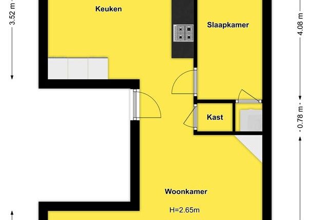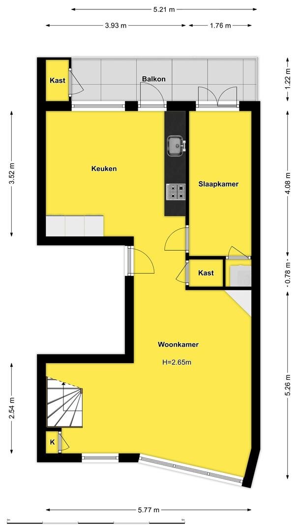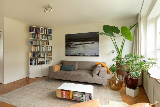 Aan de achterzijde ligt de gezellige woonkeuken met een loopdeur naar het zonnig balkon, gelegen op het westen. Ook is hier een goed bemeten slaap-of studeer kamer met openslaande deuren naar het balkon en keurig weggewerkt in een kast de aansluiting voor de wasmachine. Bij de entree is een bergkast/garderobe. Aan de voorzijde ligt de ruime en lichte L-vormige woonkamer.