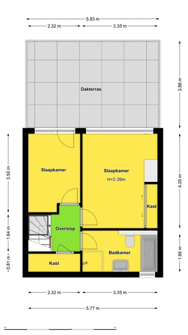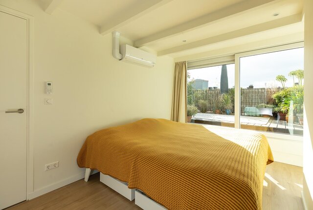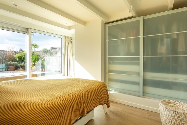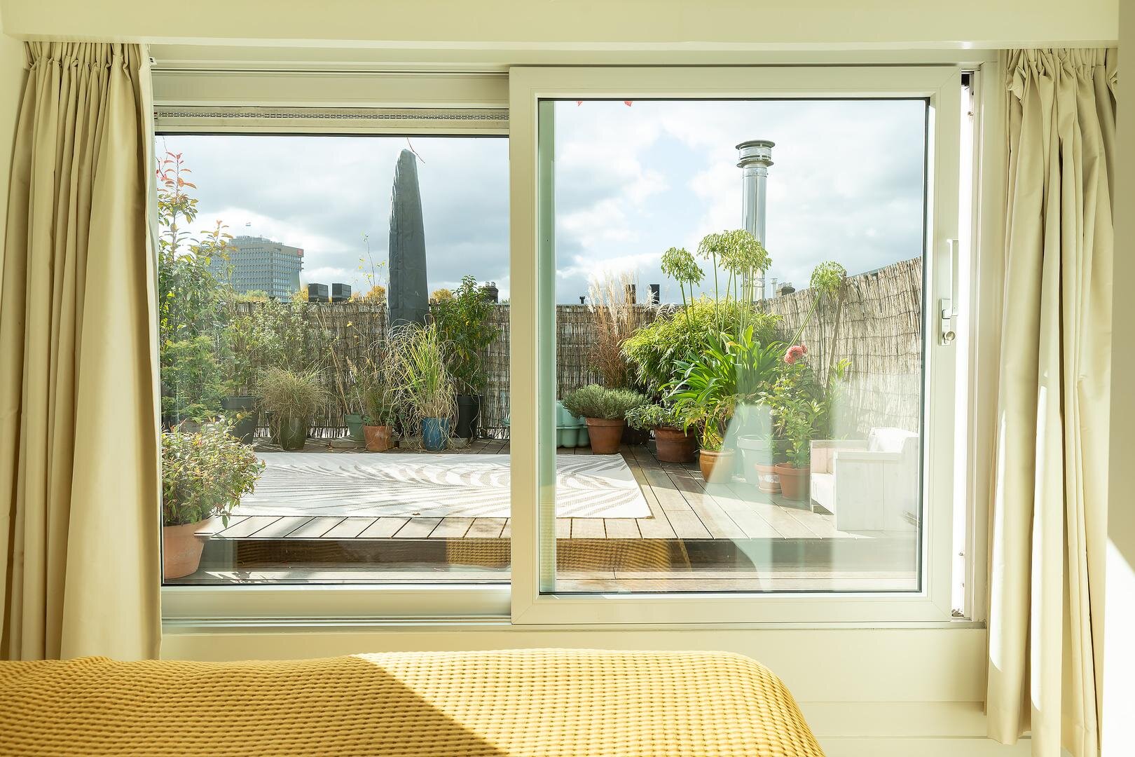 Vanuit beide slaapkamers is het heerlijk zonnige dakterras van ca 23m² te betreden. Gedurende de hele dag kan je hier genieten van de zon.