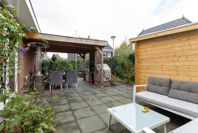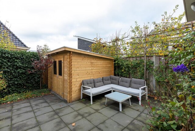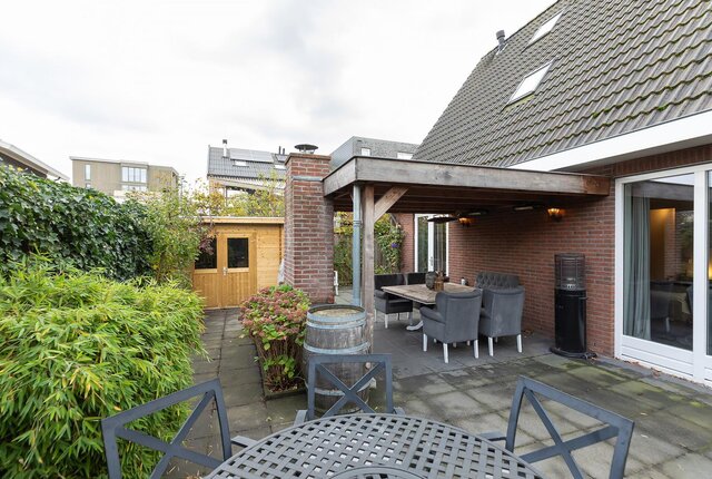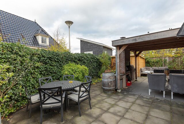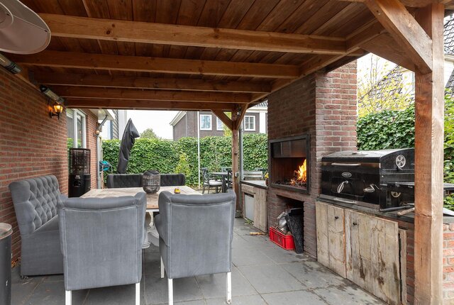 In de tuin is een sfeervolle veranda met buitenhaard, een extra houten schuur en 2 terrassen waar volop genoten kan worden van het buiten zijn.