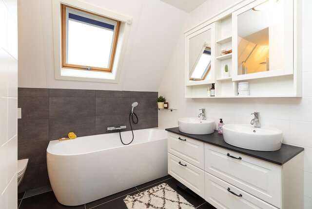 Eerste verdieping: overloop, grote ouderslaapkamer voorzien van drie dakramen en inbouwkasten, 2e ruime slaapkamer met inloopkast, badkamer voorzien van inloopdouche, wc, ligbad en wastafelmeubel, trapkast, 3e ruime slaapkamer met studeerhoek/inloopkast.