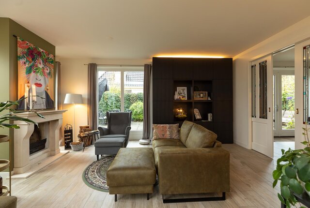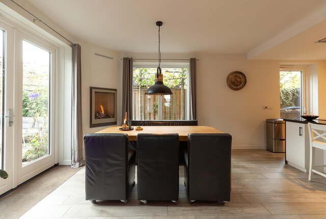 Begane grond: entree, ruime hal, waskamer met inbouwkasten, studeer-/slaapkamer met deur naar berging, uitgebreide meterkast, toilet met fonteintje, vernuftige bergkast en zitje met garderobe onder de trap, royale lichte en zonnige woonkamer voorzien van open haard, schuifdeuren met glas-in-lood naar de keuken, royale woonkeuken voorzien van gashaard, spoel- en kookeiland met hardstenen aanrechtblad, inbouwapparatuur waaronder een vriezer, vaatwasser, koffiezetapparaat en Quooker met bruiswaterfunctie. De openslaande deuren naar de zonnige tuin maken de keuken in de zomer een verlengde van de tuin.
