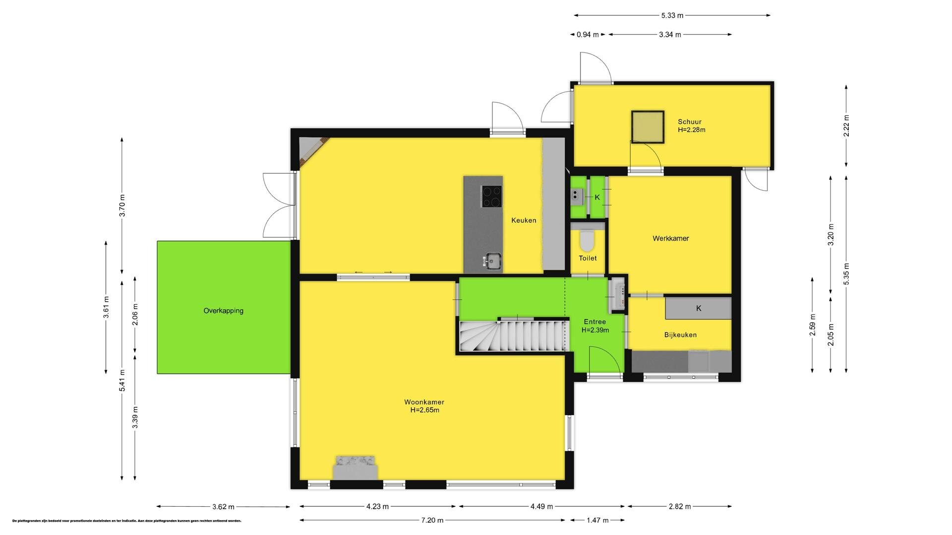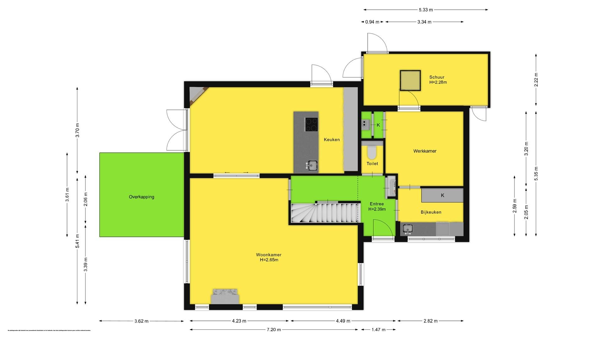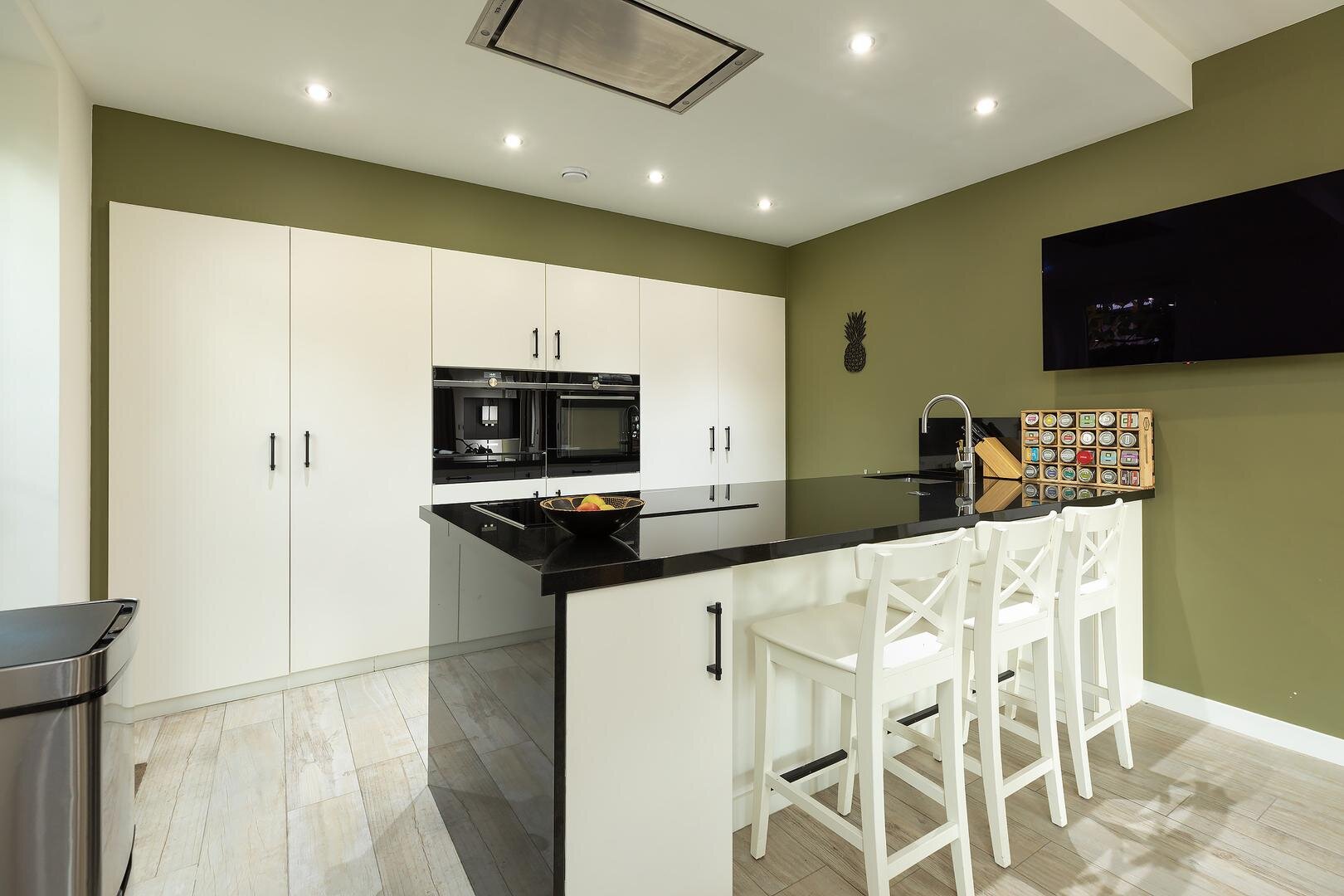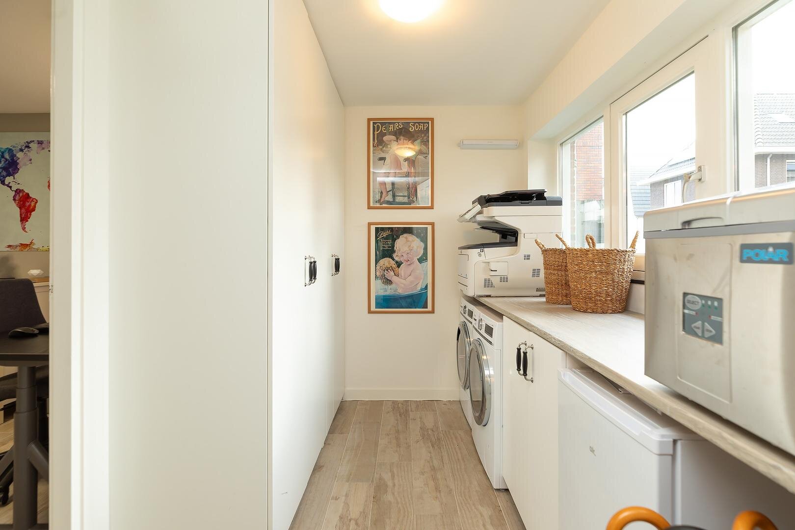 Begane grond: entree, ruime hal, waskamer met inbouwkasten, studeer-/slaapkamer met deur naar berging, uitgebreide meterkast, toilet met fonteintje, vernuftige bergkast en zitje met garderobe onder de trap, royale lichte en zonnige woonkamer voorzien van open haard, schuifdeuren met glas-in-lood naar de keuken, royale woonkeuken voorzien van gashaard, spoel- en kookeiland met hardstenen aanrechtblad, inbouwapparatuur waaronder een vriezer, vaatwasser, koffiezetapparaat en Quooker met bruiswaterfunctie. De openslaande deuren naar de zonnige tuin maken de keuken in de zomer een verlengde van de tuin.