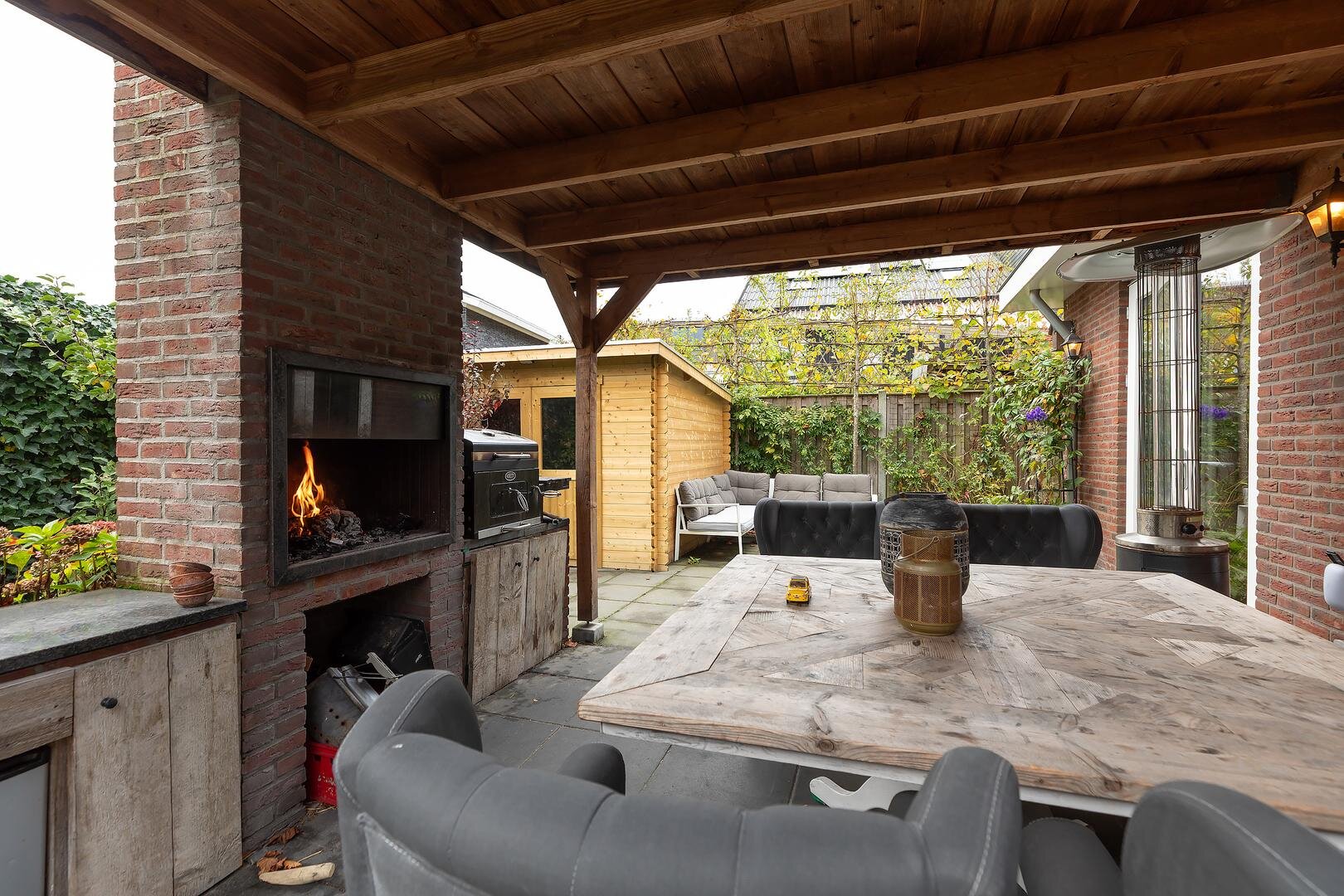 In de tuin is een sfeervolle veranda met buitenhaard, een extra houten schuur en 2 terrassen waar volop genoten kan worden van het buiten zijn.