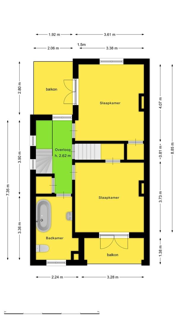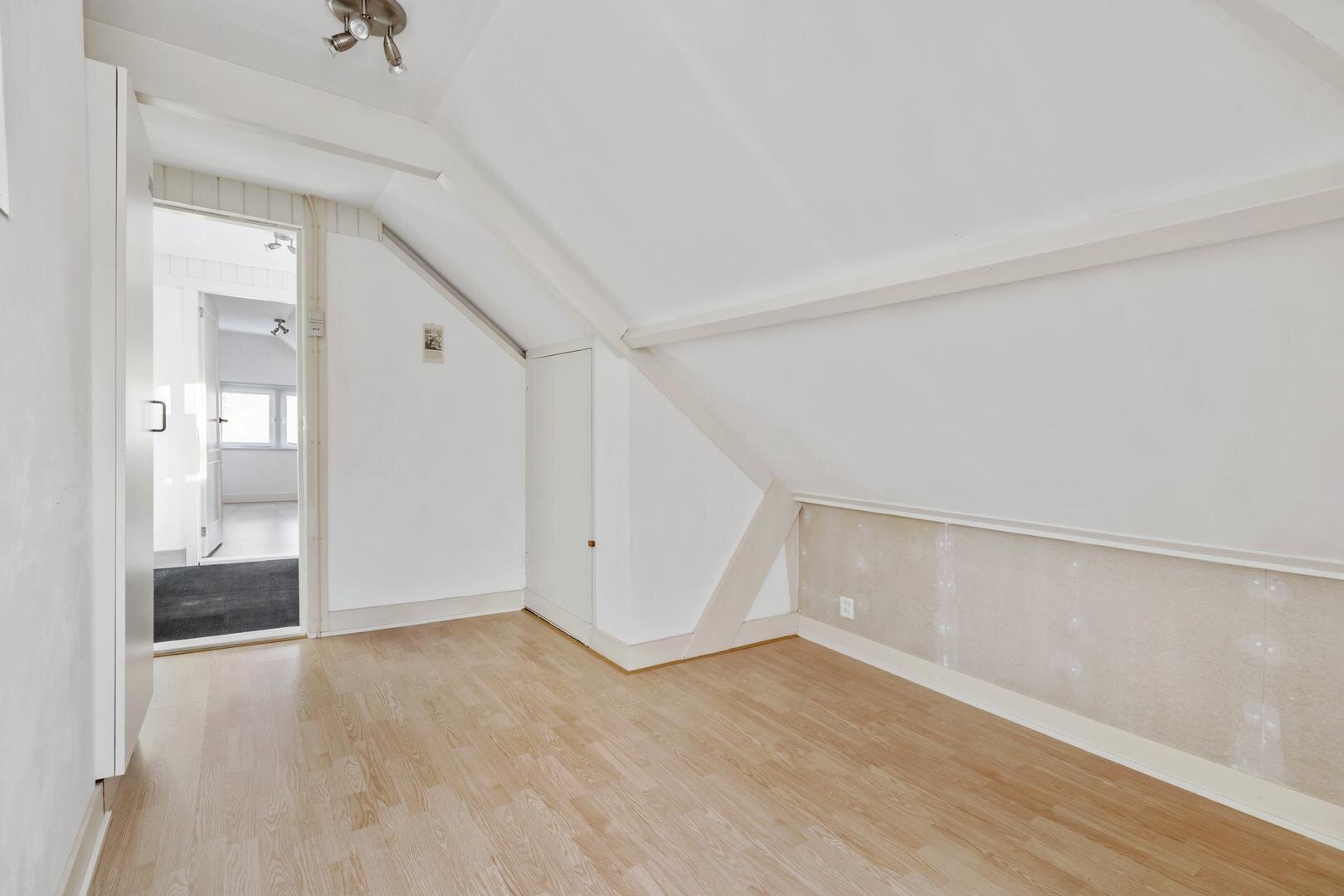 Eerste verdieping: overloop met deur naar de voorzijde, ruime kamer aan de voorzijde met inbouwkast en openslaande deuren aan de zijkant, nog een ruime slaapkamer aan de achterzijde met inbouwkast en openslaande deuren naar het inpandig balkon, badkamer met bad, wastafel en wc. Aan de overloop is een ruime bergkast welke kan worden verbouwd tot een separaat toilet.